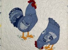 A Delight For Kitchen Breakfast Table Decor A beautiful blue hen and rooster are appliqued on a center square and framed with a border of flying geese blocks.