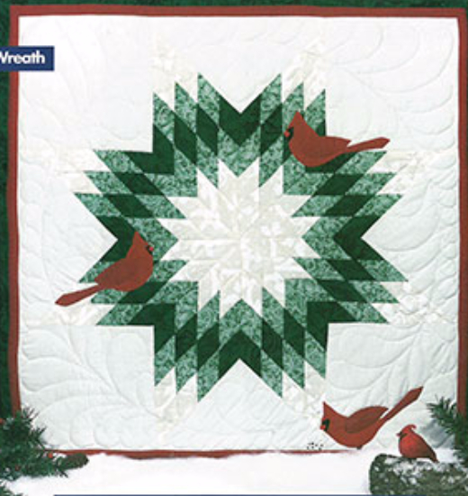 This wreath quilt can be made using seasonal colors to celebrate any season through the year. Adorn the wreath with fun applique birds. A pair of Chikadees, and a sparrow or two, and position them where you like. For winter, feature Cardinals, a beautiful Christmas wreath to put on display right through the festivities, and to the end of the season. Or leave the birds off, and enjoy making a dazzling wreath in colors of your choice.