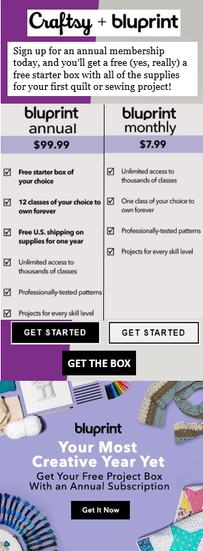 The Craftsy Bluprint annual subscription offers a free project box which contains everything you need for to make your next quilt. The box includes everything you need to make quilt from start to finish, as well as the how-to quilting video class. Get the quilt free project box and Bluprint Quilting annual subscription, available from here.