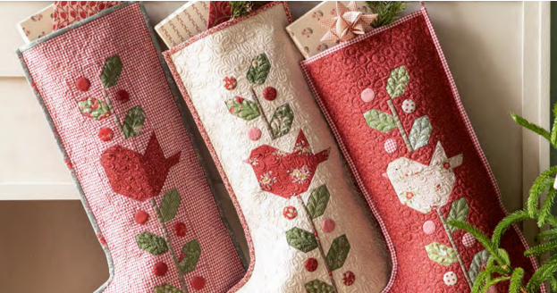 Sewing the Winter Bird stocking is a lovely mix of patchwork and applique. The stocking is generously sized, plenty of room for gifts or as a decorative hanging piece in your festive décor.