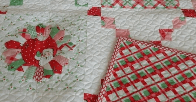 Ten inch squares make for easy cutting for the chain blocks and dresdens. The best part is finding the perfect fussy cut to put in the centre. However when Sherri of A Quilting Life wasn’t always able to center the print because of limited fabric, it turned out just right as the jolly Santa ended up being off-center, sort of peeking around the corner.