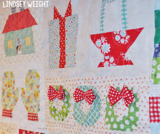 Use snowy prints and jolly holly Christmas prints. Put bows on the wreaths. Make each block with childish delight. Give up on choosing a favorite. Choosing the fabric for each block is over-the-top-fun and puts your own spin on the designs. I had to share Lindsey’s Christmas quilt.